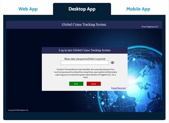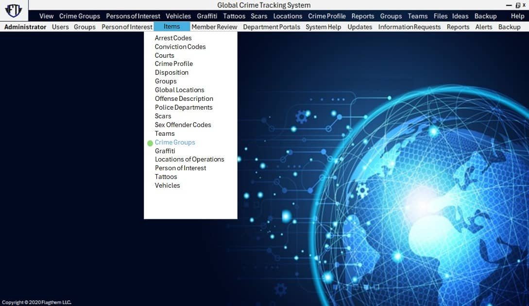 The Global Crime Tracking System by FlagThem LLC could be the most advanced crime tracking system available for law enforcement today. This down loadable software program has the ability to track any type of criminal organization globally, from where it starts to where it finishes. It tracks vehicles, license plates, crime locations, crime profiles, tattoos, scars, graffiti tags, and crime network membership. It is one of the only software packages that performs automatic gang member evaluations.
